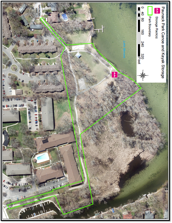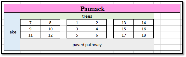 Paunack (6399 Bridge Rd): 3 standard racks, 18 spaces in total. Park either on the street on Waunona Way or the in public parking lot on Inland Way, then walk down the Lake Loop/Bike Path to Paunack Park. There may be other racks in the area that are on private property but not fenced off from the park land, so be sure you are looking at our racks. Ours are near the canoe/kayak launch site along a row of trees (on the side of the park with the basketball court). The rack spaces are not in order, so be sure to pay attention to the space numbers. See diagram below.
