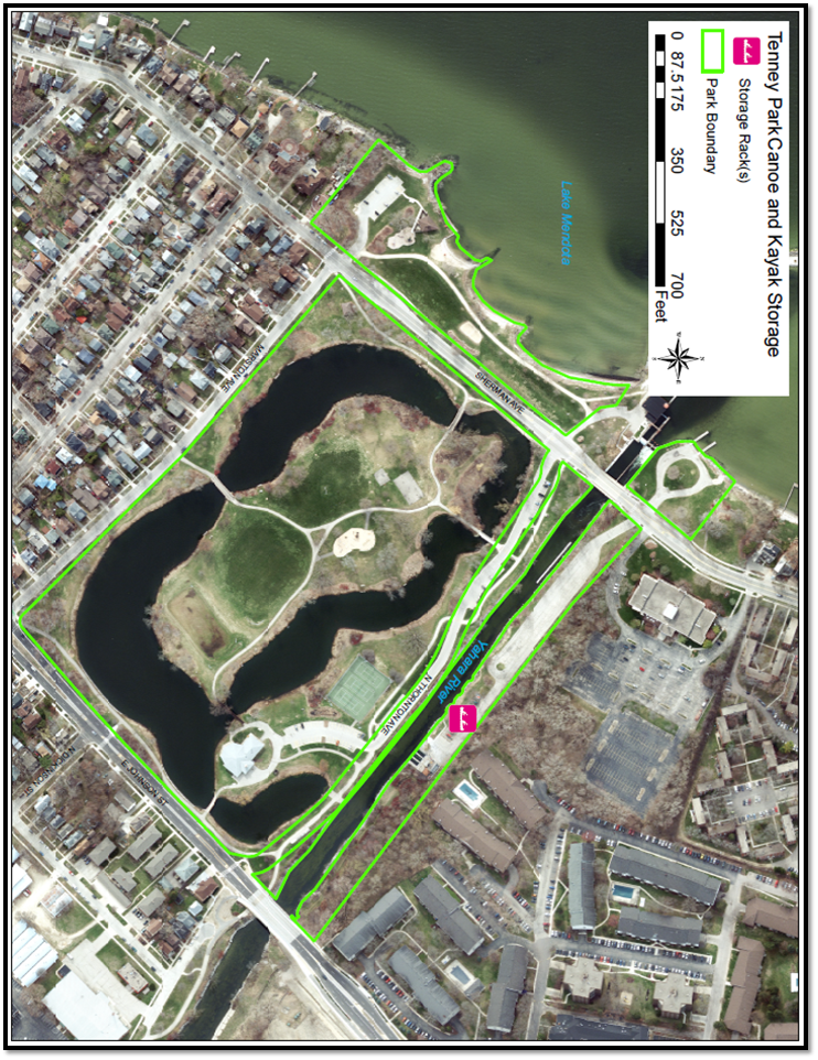 Tenney (1615 Sherman Ave): 10 racks, 1 of which is standard, the other 9 are seven spaced racks, 69 spaces in total. Parking Lot available but note that long stalls are for vehicles with trailers only. The rack spaces are largely in numeric order but since the racks are not a standard six space rack, please be sure to pay attention to the space numbers.