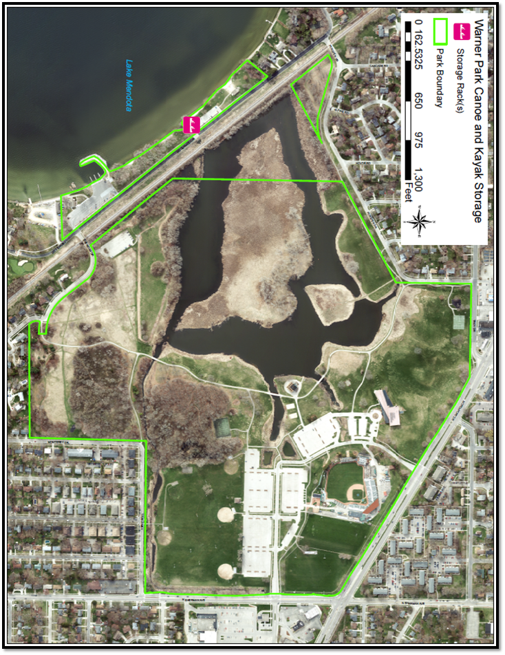 Warner Beach (1101 Woodward Dr): 2 standard racks, 12 spaces in total.  Parking Lot available. Warner Park is very large, so be sure you are at Warner Beach (1101 Woodward Dr) and are not looking at the racks that are on the lagoon closer to the Warner Park Recreation Center, as those belong to the Recreation Center.
